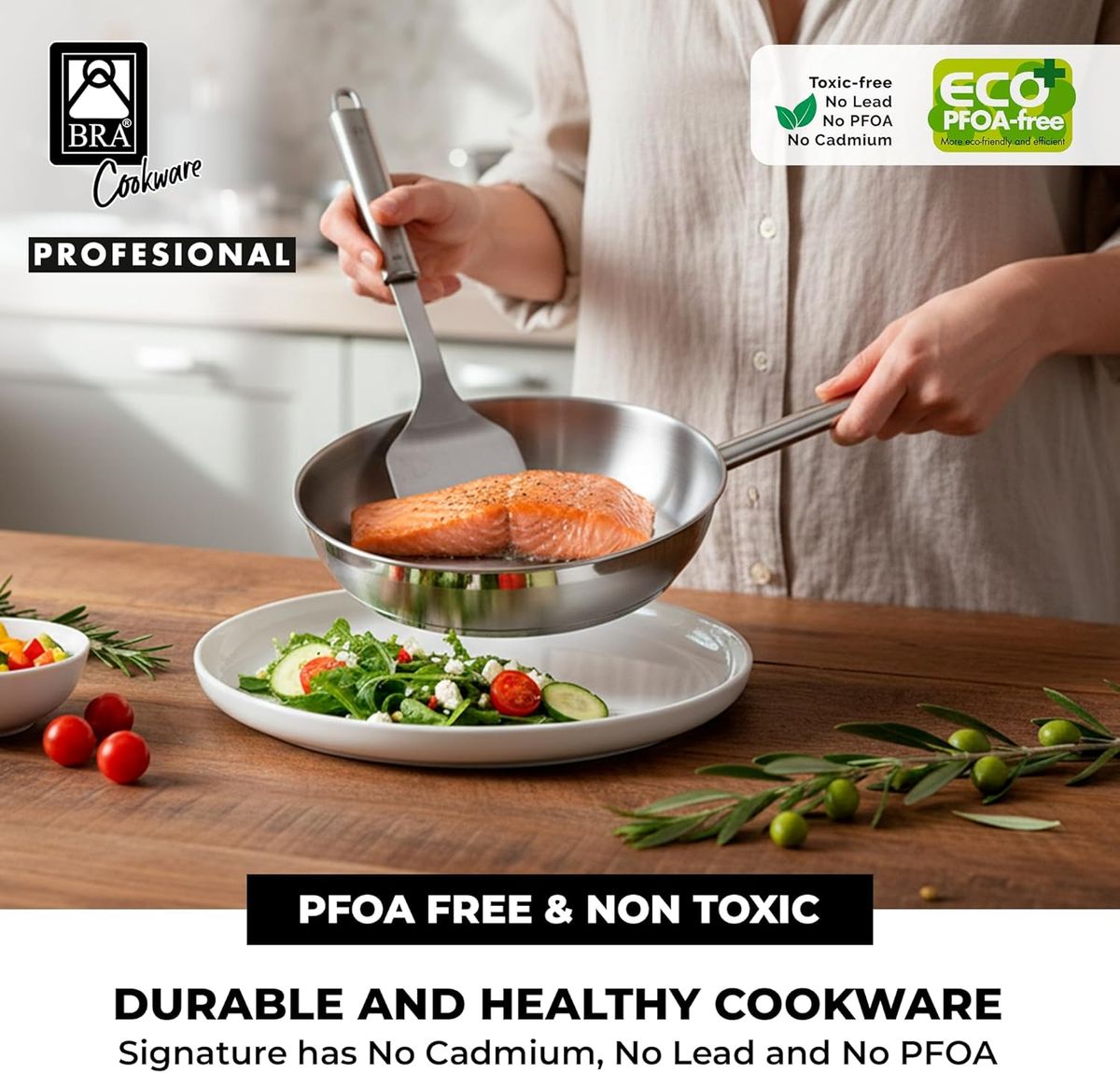 La sartén profesional de acero inoxidable Bra de 24 cms sin antiadherente está diseñada para quienes buscan máxima resistencia, cocción precisa y resultados de nivel profesional. Fabricada en acero inoxidable de alta calidad con triple fondo difusor, reparte el calor de forma uniforme para cocinar con mayor control y eficiencia. Ideal para sellar carnes, saltear verduras, dorar pescados o preparar recetas exigentes donde se busca una superficie robusta y duradera. Su acabado sin recubrimiento antiadherente permite trabajar a altas temperaturas y aprovechar mejor los jugos y sabores naturales de los alimentos. Apta para todo tipo de cocinas, incluida inducción, y también para horno. Una pieza versátil, duradera y perfecta tanto para uso diario como para amantes de la cocina más técnica.